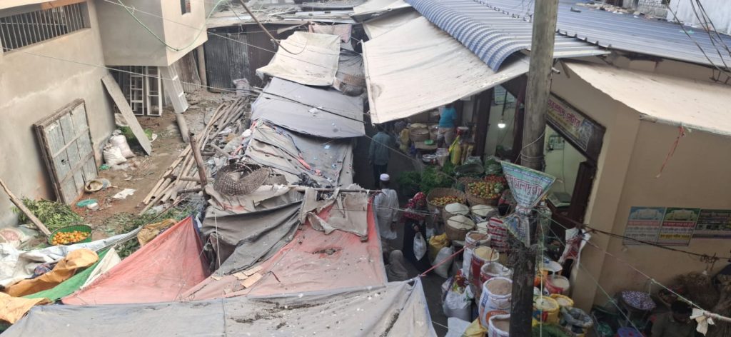 বাজারে আসা ক্রেতা মো. আলী বলেন, এখানে স্বাভাবিকভাবে হাঁটারও উপায় নেই। নির্মাণসামগ্রীর কারণে পথ সরু হয়ে গেছে।