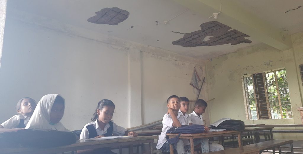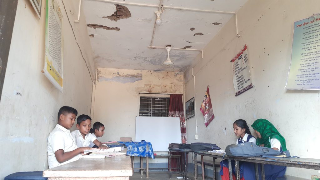 বিদ্যালয়ের ৩য় শ্রেণির শিক্ষার্থী জান্নাতুল ফেরদৌস ও ৪র্থ শ্রেণির আদুল্লাহ আল মায়েদ জানায়, ‘আমাদের স্কুলের বিল্ডিং পুরানো হয়ে গেছে। পাশের রাস্তা দিয়ে বড় গাড়ি গেলে ভবনটা কেঁপে উঠে। পায়ই ছাদ থেকে প্লাস্টার খসে পড়ে। গত মাসেও প্লাস্টার খসে পড়ে আমাদের কয়েকজন সহপাঠি মাথায় আঘাত পেয়েছে। সব সময় আমরা আতঙ্কে থাকি। তবুও জীবনের ঝুঁকি নিয়ে ক্লাস করছি।”